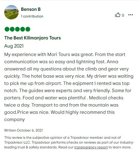 Park Fees: All Kilimanjaro National Park entry, camping, and rescue fees are included.